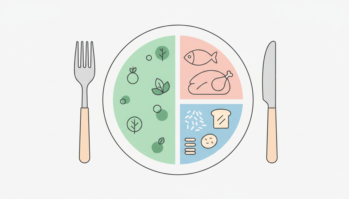 視覺化指南,教你如何構建均衡餐盤(½ 非澱粉類蔬菜、¼ 瘦肉蛋白質、¼ 複合碳水化合物)。